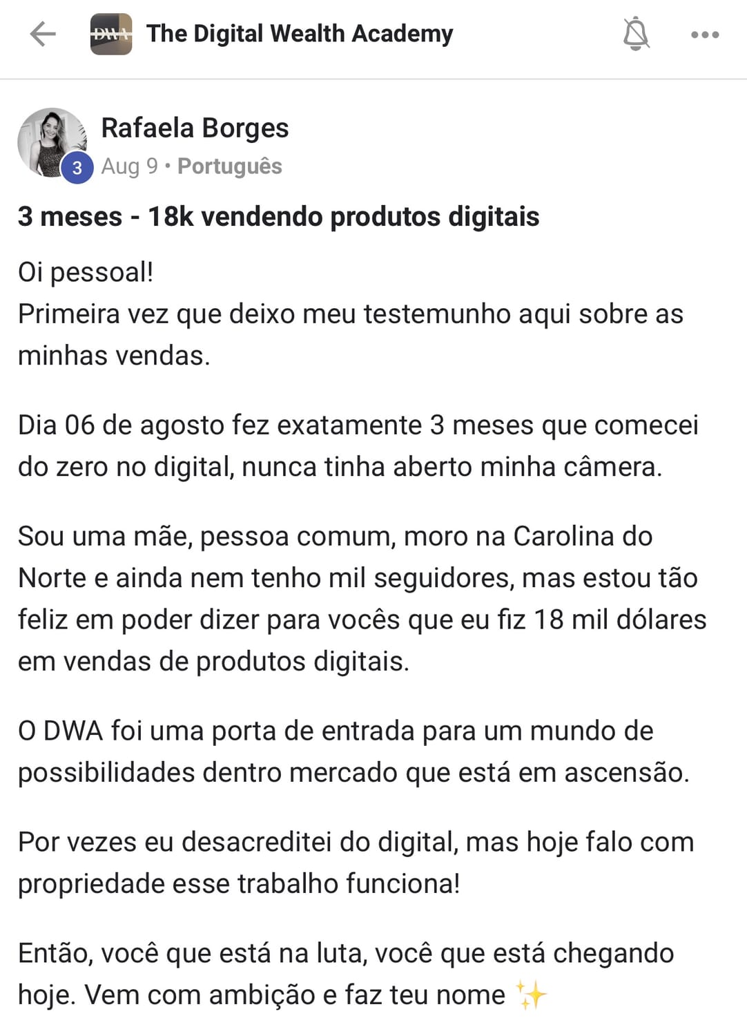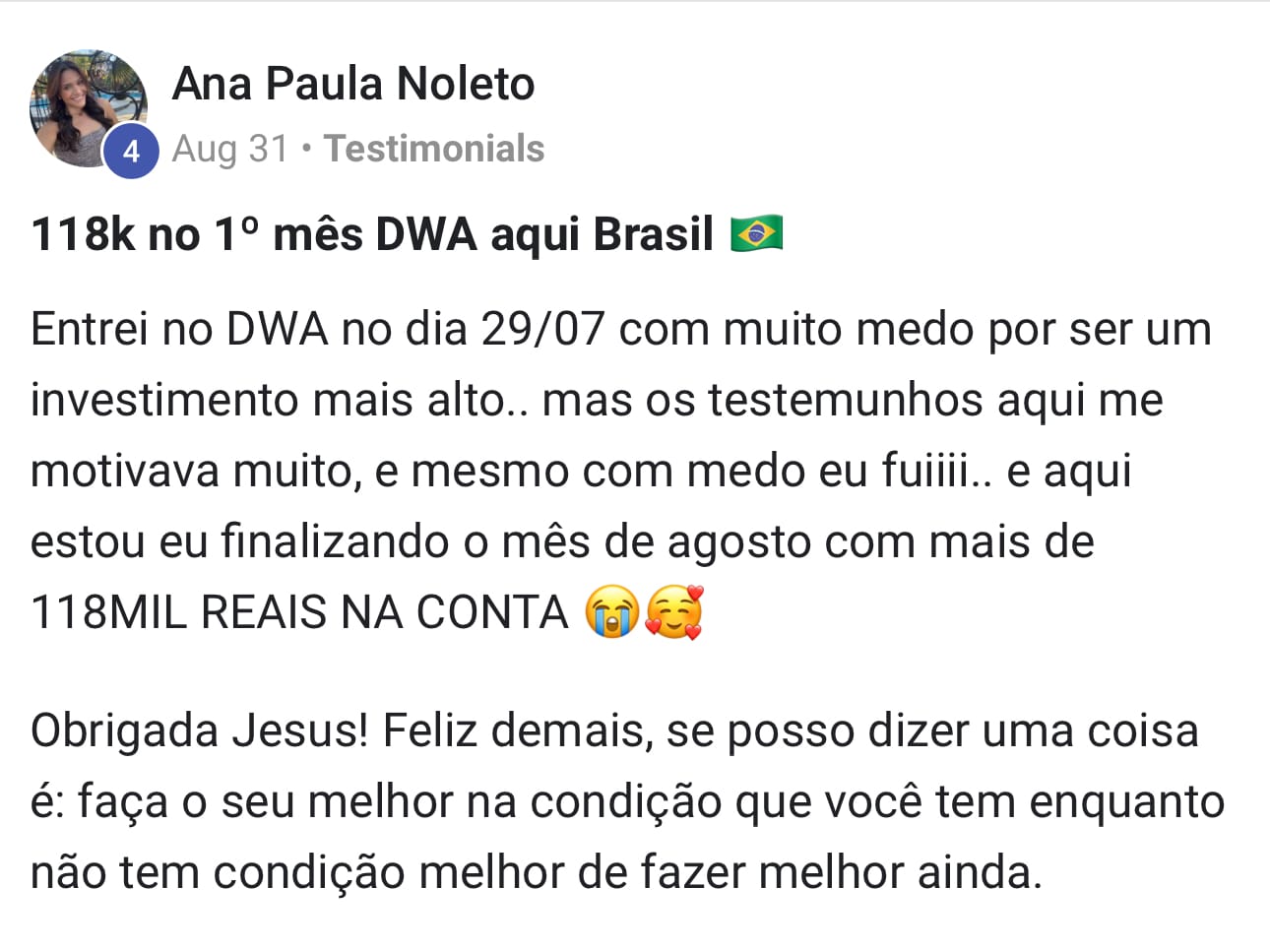 Se você deseja fazer renda extra de maneira simples, sem planos mirabolantes, o DWA é para você! Este programa tem tudo coberto para você. Nenhum outro programa no mercado me gerou mais receitas de 6 dígitos em um mês do que o DWA.