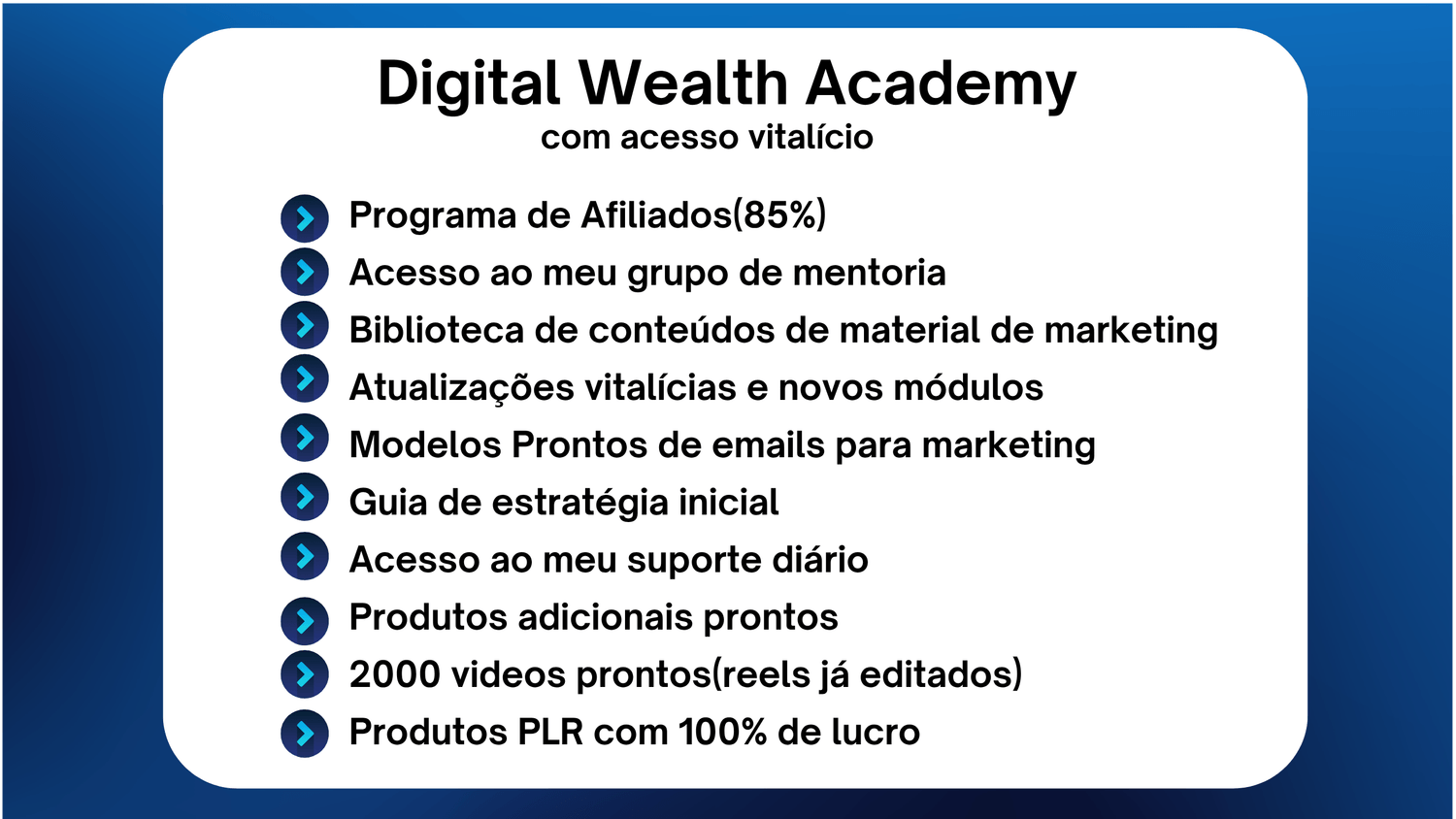 O Digital Wealth Academy abrange um curso robusto de marketing digital completo, com sessões semanais de coaching, uma comunidade exclusiva e uma valiosa licença de revenda. Ele oferece o passo a passo de tudo que você irá usar, incluindo lições básicas, cultivo de mentalidade, domínio de marca, táticas de crescimento em mídias sociais, estratégia de funil e insights de marketing por e-mail. Este pacote abrangente foi projetado não apenas para educar, mas também para capacitá-lo com ferramentas práticas e uma rede de apoio, colocando você no caminho do sucesso no dinâmico mundo do marketing digital.